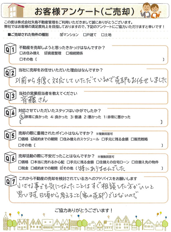 以前から手厚く対応していただいているので売却もお任せしました